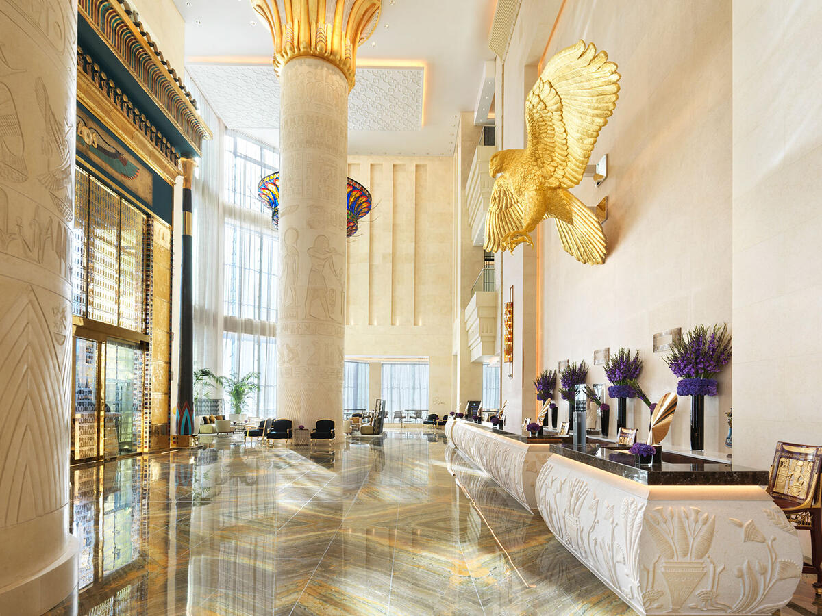 Bei Ihrer Ankunft im Sofitel Dubai The Obelisk durchschreiten Sie prächtige, riesige Türen im Stil eines ägyptischen Tempeleingangs. Begrüßt werden Sie von einem 9 m breiten und 3,75 m hohen Goldenen Falken, dem Nationalvogel der VAE. Durch riesige Säulen mit Hieroglyphen gelangen Sie dann in das Tal der Könige und Königinnen in Luxor, Ägypten.
