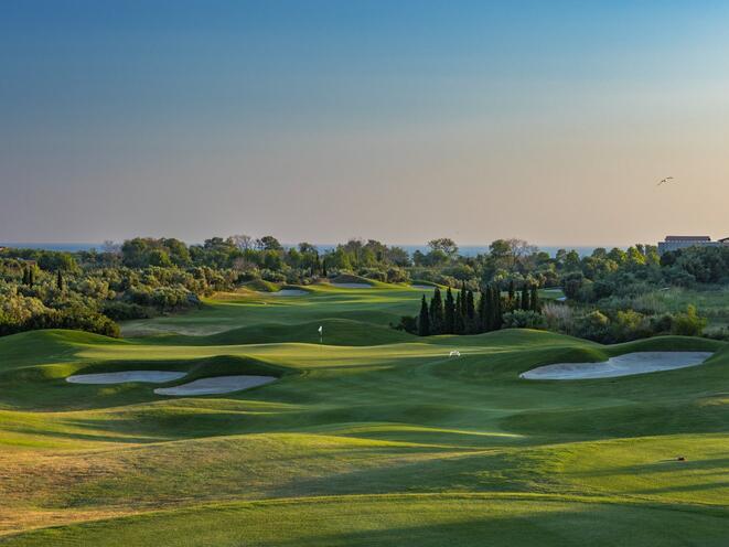 Der International Olympic Academy Golf Course im Costa Navarino Resort ist ein Meisterwerk, entworfen von dem zweifachen Masters-Champion José María Olazábal. Der 18-Loch-Par-72-Platz erstreckt sich über 125 Hektar hügeliges Gelände und bietet atemberaubende Ausblicke auf die historische Bucht von Navarino und das Ionische Meer. Mit einer Länge von 6.366 Metern (6.960 Yards) ist der Platz so gestaltet, dass er Golfer aller Spielstärken herausfordert.